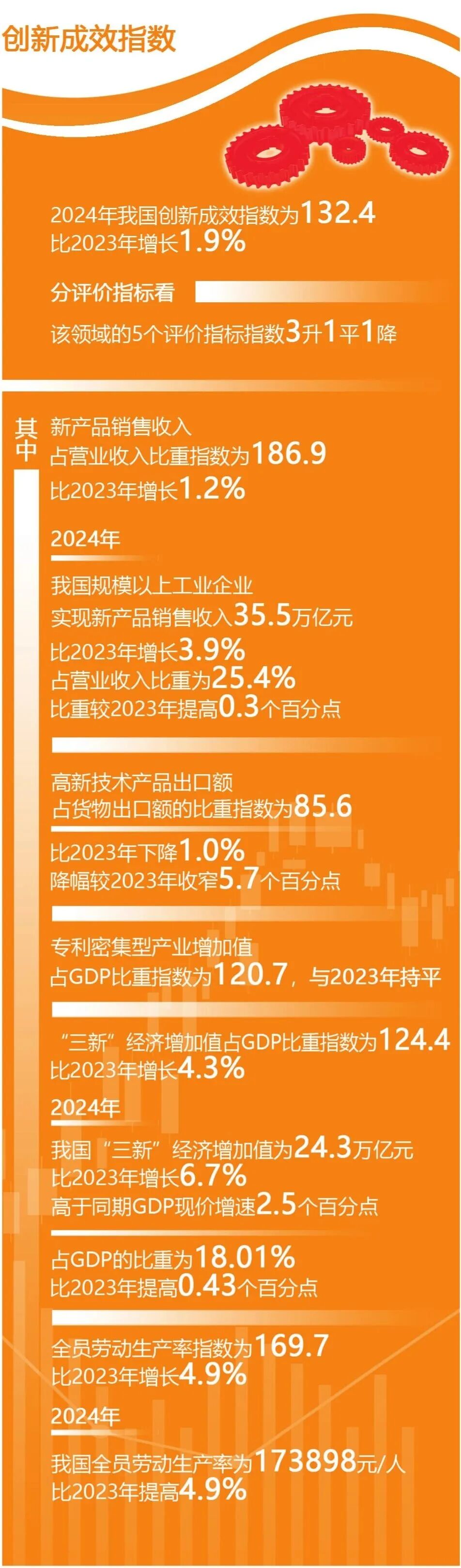 创新成效稳步显现,新动能持续壮大。数据显示,2024年我国创新成效指数达132.4.比2023年增长1.9%。经济提质增效成果显著,全员劳动生产率提高4.9%,达173898元/人。2024年,“三新”经济增加值达24.3万亿元,占GDP比重升至18.01%,增速高于同期GDP现价增速2.5个百分点。企业创新成果转化加速,规上工业企业新产品销售收入占比提升至25.4%。尽管高新技术产品出口比重略有下降,但降幅较2023年收窄5.7个百分点,呈现企稳回升态势。