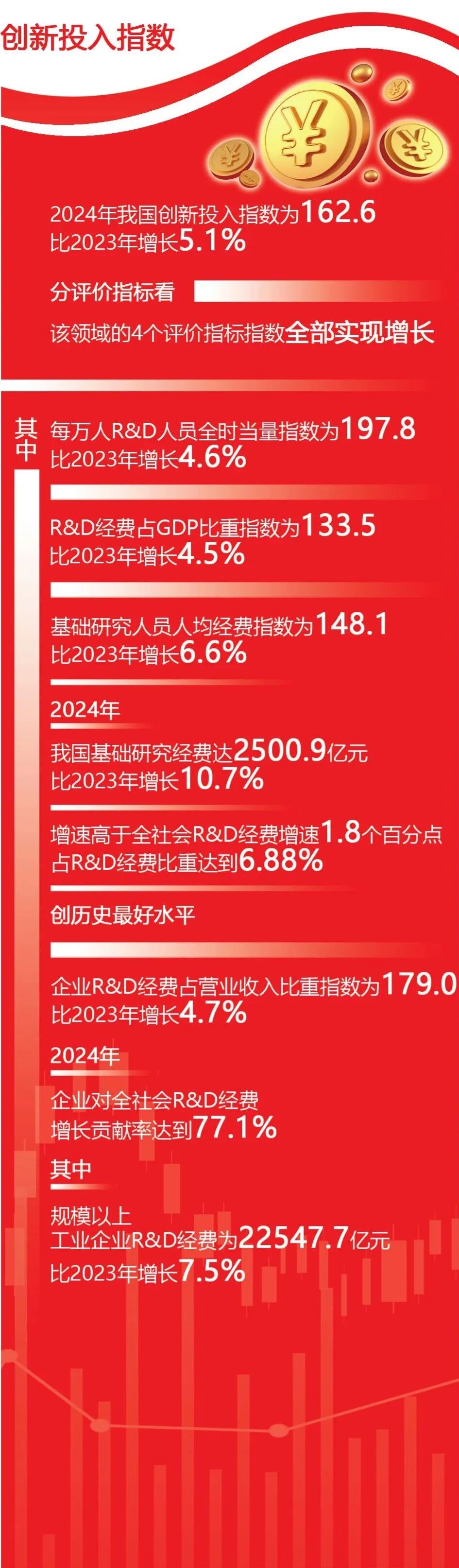 创新投入的持续加大为未来发展积蓄动能。数据显示,2024年我国创新投入指数达162.6.比2023年增长5.1%。研发投入规模与质量同步提升,R.D经费占GDP比重指数增长4.5%。特别值得注意的是,2024年,我国基础研究经费达2500.9亿元,增长10.7%,占R.D经费比重创6.88%的历史新高。企业创新主体地位进一步巩固,对全社会R.D经费增长贡献率达77.1%,规上工业企业研发经费增长7.5%,展现出强劲的创新活力。