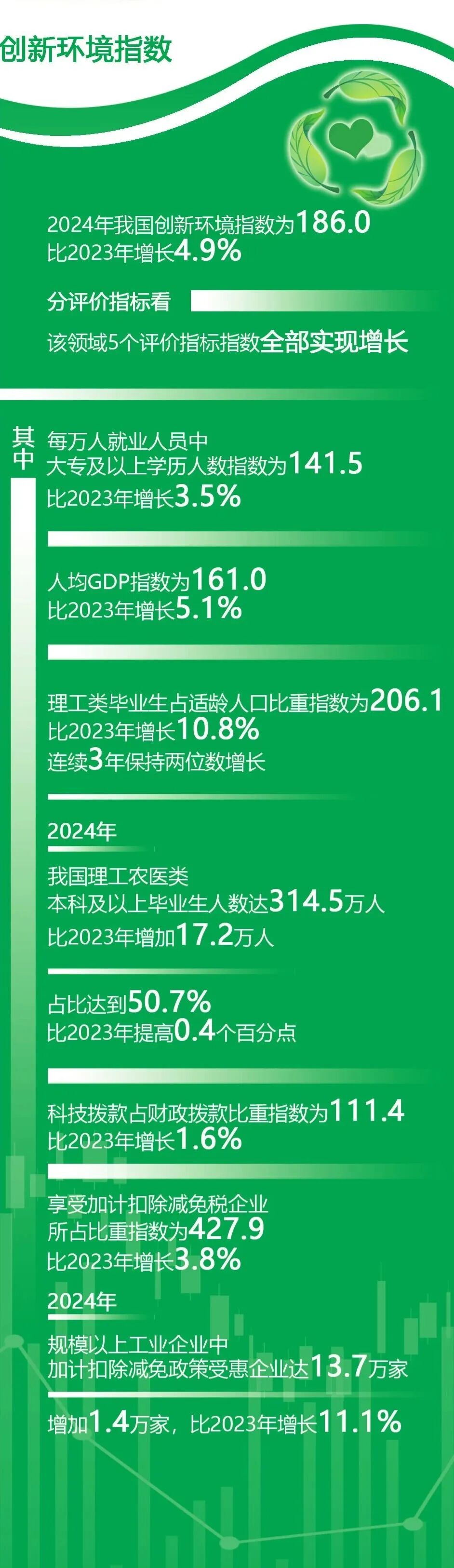 创新生态的持续优化为创新能力提升奠定了坚实基础。数据显示,2024年我国创新环境指数达186.0.比2023年增长4.9%,五项细分指标全面增长。其中,人才资源方面表现尤为突出,理工类毕业生占适龄人口比重指数达206.1.连续三年保持两位数增长。2024年,理工农医类本科及以上毕业生达314.5万人,占比突破50.7%。同时,政策支持力度持续加大,享受加计扣除减免税企业所占比重指数高达427.9.受惠规上工业企业达13.7万家,同比增长11.1%。这些进展在人均GDP指数增长5.1%的宏观背景下,共同构建了更加优越的创新环境。