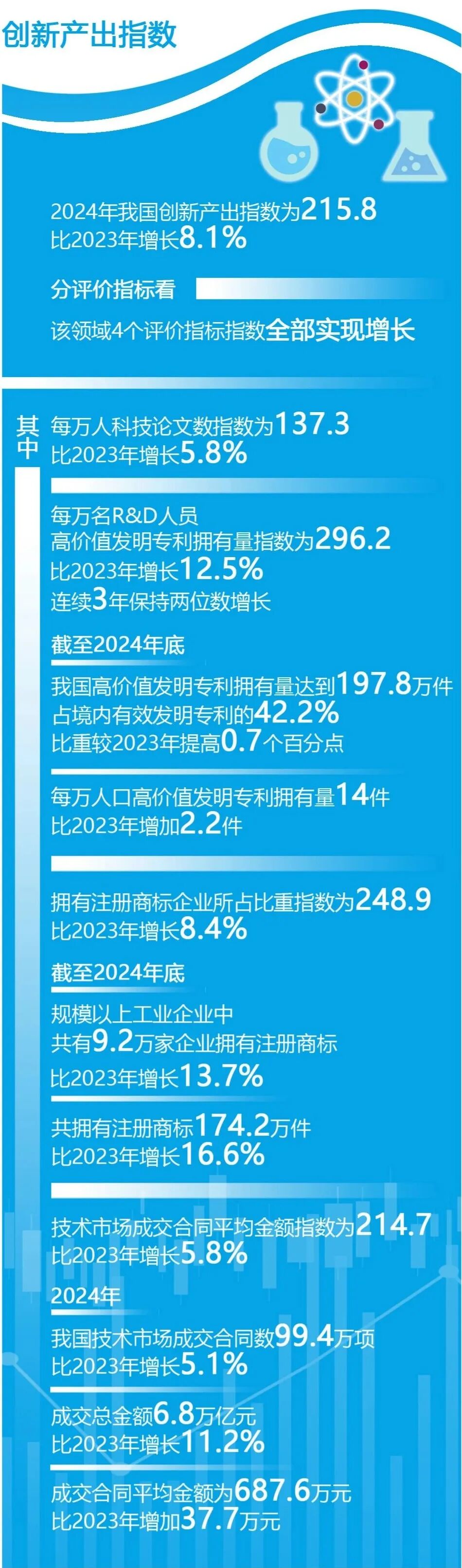 创新产出实现量质齐升,成果丰硕。数据显示,2024年我国创新产出指数达215.8.比2023年增长8.1%,增速居各分项之首。知识产权创造运用能力显著增强,每万名R.D人员高价值发明专利拥有量指数增长12.5%,连续三年保持两位数增长。截至2024年底,高价值发明专利拥有量达197.8万件,占有效发明专利比重提升至42.2%。科技成果转化效率明显提高。2024年,我国技术市场成交金额达6.8万亿元,增长11.2%,平均合同金额增至687.6万元,显示出科技成果市场价值的不断提升。